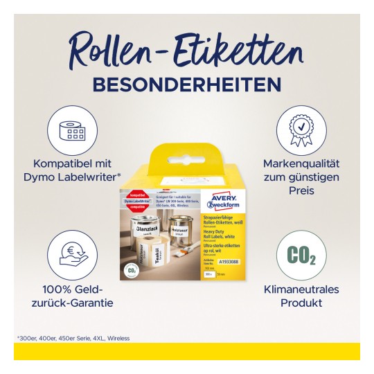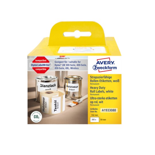 Calitate de la expertul în etichete: etichetele albe, rezistente la uzură, pe rolă A1933088 în format 59 x 102 mm de la Avery Zweckform sunt compatibile cu Dymo Labelwriter* (300er-, 400er-, 450er-Serie, 4XL, Wireless). Proiectați și imprimați o singură etichetă sau mai multe etichete rapid și ușor cu software-ul dvs. Dymo*. Etichetele corespund formatului Dymo* 1933088. Etichetele foliei sunt rezistente la apă și zgârieturi și rezistente la murdărie, ulei, temperatură (-20°C până la +60°C) și agenți de curățare. Etichetele sunt perfecte pentru aplicări mai dure în casă și grădină, garaj, atelier, cantină etc. Un pachet conține 300 de etichete pe o rolă. Satisfacția deplină garantată sau vă veți primi banii înapoi (termeni și condiții la www.avery.eu). Think & Care - Avery Zweckform este neutru din punct de vedere climatic din 2020: emisiile de gaze cu efect de seră ale locației sunt compensate de proiecte certificate de protecție a climei. Din 2014 a fost folosită doar electricitate/gaz verde. Cercetarea, dezvoltarea, producția, logistica și administrarea la locația companiei din Oberlaindern/Bavaria garantează cele mai înalte standarde de calitate și de mediu, precum și rute scurte de livrare. Etichetele de folie fără PVC sunt un produs neutru din punct de vedere climatic, emisiile de gaze cu efect de seră ale materialului sunt compensate de proiecte certificate de protecție a climei. *DYMO și DYMO LABELWRITER sunt tranzacții înregistrate ale Newell Rubbermaid Europe LLC. Avery Zweckform nu este afiliat cu Newell Rubbermaid.