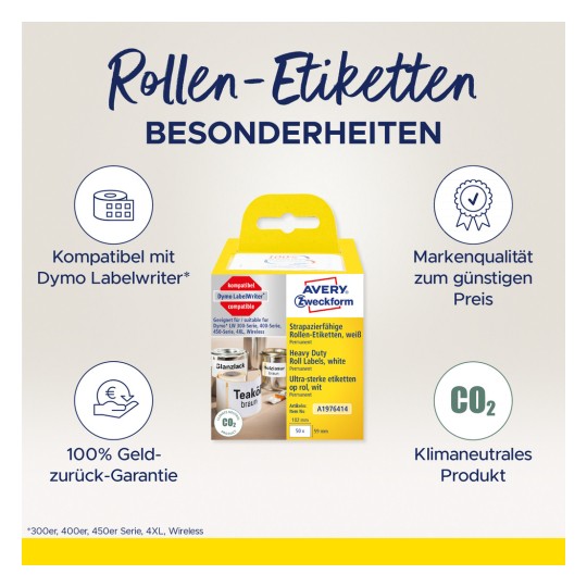 Calitate de la expertul în etichete: etichetele rulouri extra grele A1976414 în format 59x102mm de la Avery Zweckform sunt ideale ca semne de indicare și avertizare și pentru etichetare în depozit, producție și ateliere. Etichetele sunt 100% compatibile cu Dymo® Labelwriter™ (seria LW330T, LW400 și seria LW450). Etichetele sunt rezistente la apă, murdărie, ulei și temperatură (-20°C până la +60°C), precum și rezistente. la majoritatea detergenţilor. Etichetele sunt perfecte pentru aplicări mai dure în casă și grădină, garaj, atelier, cantină etc. Un pachet conține 50 de etichete pe o rolă. Satisfacția deplină garantată sau vă veți primi banii înapoi (termeni și condiții la www.avery.eu). Think & Care - Avery Zweckform este neutru din punct de vedere climatic din 2020: emisiile de gaze cu efect de seră ale locației sunt compensate de proiecte certificate de protecție a climei. Din 2014 a fost folosită doar electricitate/gaz verde. Cercetarea, dezvoltarea, producția, logistica și administrarea la locația companiei din Oberlaindern/Bavaria garantează cele mai înalte standarde de calitate și de mediu, precum și rute scurte de livrare. Etichetele de folie fără PVC sunt un produs neutru din punct de vedere climatic, emisiile de gaze cu efect de seră ale materialului sunt compensate de proiecte certificate de protecție a climei. *DYMO și DYMO LABELWRITER sunt tranzacții înregistrate ale Newell Rubbermaid Europe LLC. Avery Zweckform nu este afiliat cu Newell Rubbermaid.