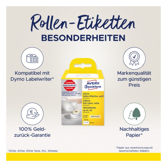 Calitate de la expertul în etichete: etichetele de adresă adezive permanente albe pe rolă AS0722370 în format 28 x 89 mm de la Avery Zweckform sunt compatibile cu Dymo Labelwriter* (300er-, 400er-, 450er-Serie, 4XL, Wireless), Imprimantă inteligentă de etichete Seiko®. Proiectați și imprimați o singură etichetă sau mai multe etichete ușor și rapid cu propriul dvs. software Dymo*. Etichetele corespund formatelor Dymo* S0722370 (99014) și Seiko® SLP-2RL. Etichetele sunt potrivite pentru o gamă largă de aplicări legate de adresare, expediere și etichetare. Un pachet conține 2 role cu 130 de etichete fiecare. Etichetele rulouri au o aderență foarte puternică, sunt fără PVC și albite fără clor. În plus, nu conțin bisfenol A (BPA), în conformitate cu legislația UE. Satisfacția deplină garantată sau vă veți primi banii înapoi (termeni și condiții la www.avery.eu). Think & Care - Avery Zweckform este neutru din punct de vedere climatic din 2020: emisiile de gaze cu efect de seră ale locației sunt compensate de proiecte certificate de protecție a climei. Din 2014 a fost folosită doar electricitate/gaz verde. Cercetarea, dezvoltarea, producția, logistica și administrarea la locația companiei din Oberlaindern/Bavaria garantează cele mai înalte standarde de calitate și de mediu, precum și rute scurte de livrare. Materialul de vârf al acestor etichete albite fără clor este fabricat din hârtie 100% certificată FSC® din păduri gestionate responsabil. *DYMO și DYMO LABELWRITER sunt mărci comerciale înregistrate ale Newell Rubbermaid Europe LLC. Avery Zweckform nu este afiliat cu Newell Rubbermaid.